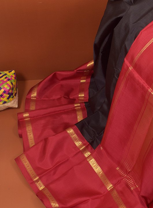 Korvai weaving demands fine skills which were passed on as oral tradition from father to son. The body of the saree is in a different colour contrasting with the border which is in one solid colour where the weft of the body colour does not interlock with the warp threads of the border making it a double shade. In this technique the body of the sari is woven separately and the border separately on the same loom and the two interlocked by skilful weaving. The pallu is woven as a solid contrast coloured block with the petni form of weaving . these days it is common to use the kattu saayam where the threads are dyed, to save hours of weaving time.